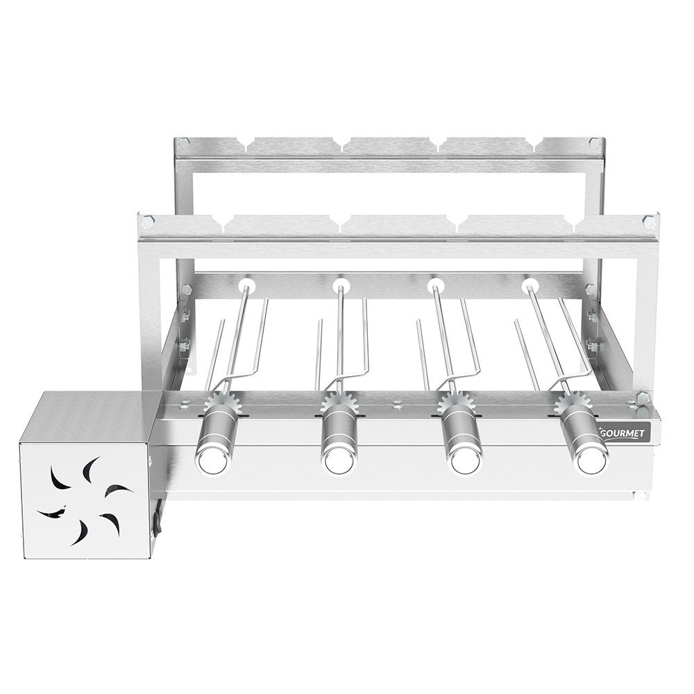 Churrasqueira Giratória para alvenaria ou pré-moldada, com espetos giratórios, possibilitam uma cocção homogênea e acompanha Grelha superior removível.